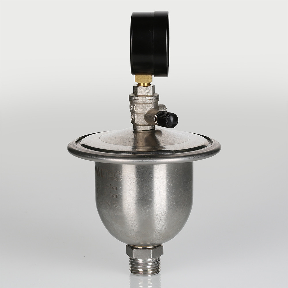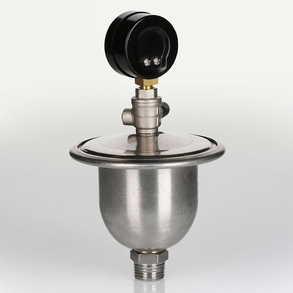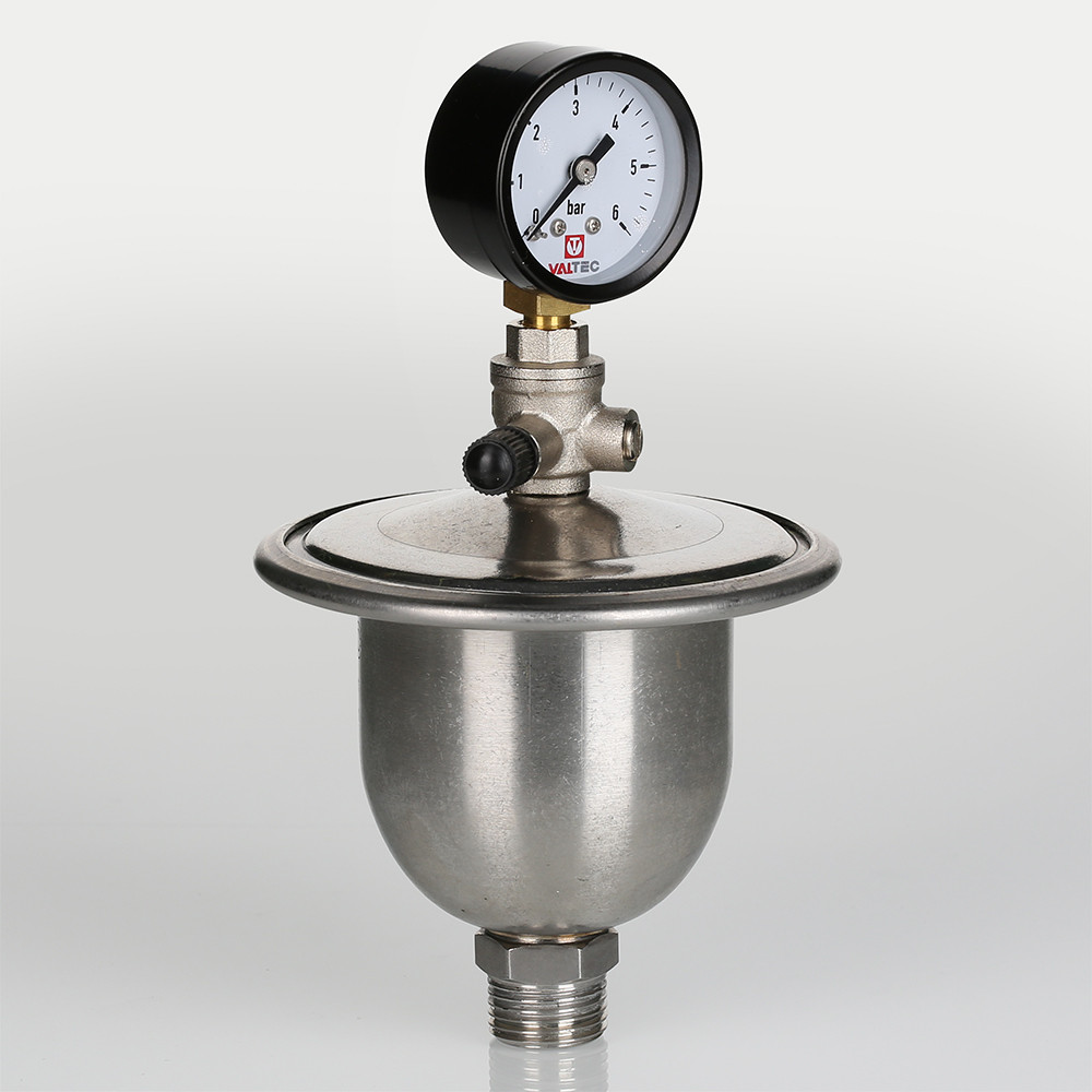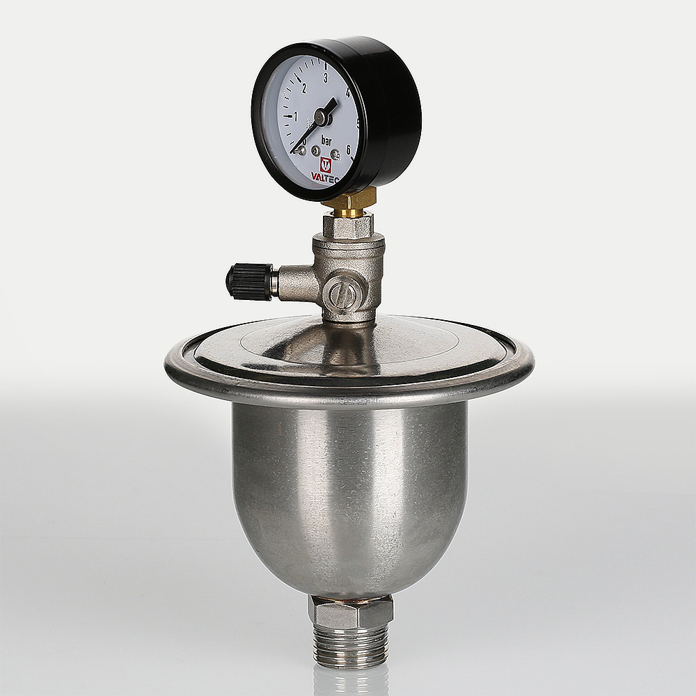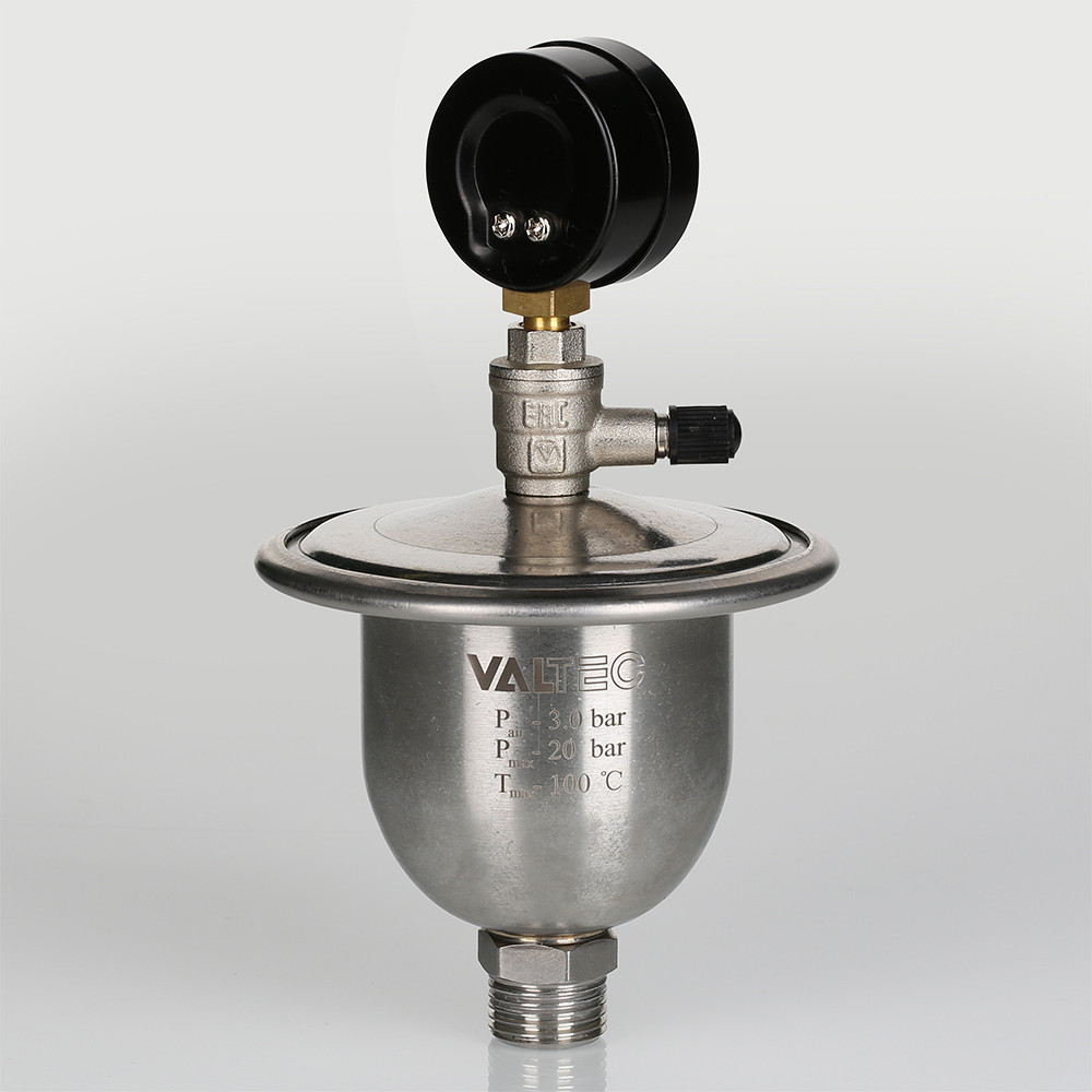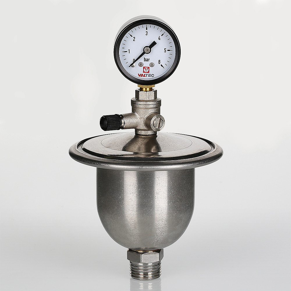 Гаситель гидроударов мембранный с манометром VT.CAR20 является продолжением хорошо зарекомендовавшей себя в эксплуатации модели VT.CAR19. Основная особенность новой модификации – возможность оперативного контроля давления в воздушной камере. Это очень важно, ведь если давление в камере опустится ниже расчетного, гаситель не сможет полноценно выполнять свои функции (кроме сглаживания гидравлических ударов, прибор принимает в себя объем воды, образовавшийся при нагревании поступившей в квартиру холодной воды).