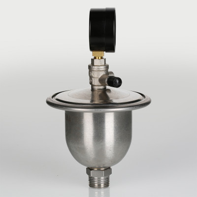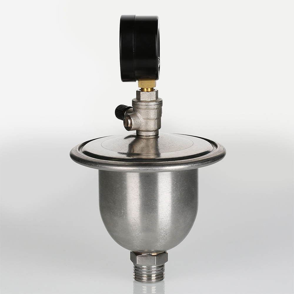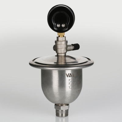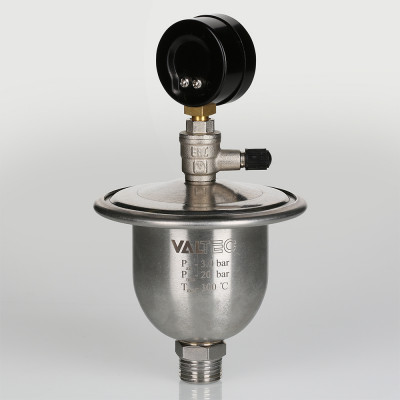 Для контроля работоспособности гасителя гидравлических ударов VT.CAR20 в конструкцию ниппельного штуцера введен миниатюрный шаровой кран с манометром. Жилец в любой момент может открыть шаровой кран и проверить давление в воздушной камере гасителя.