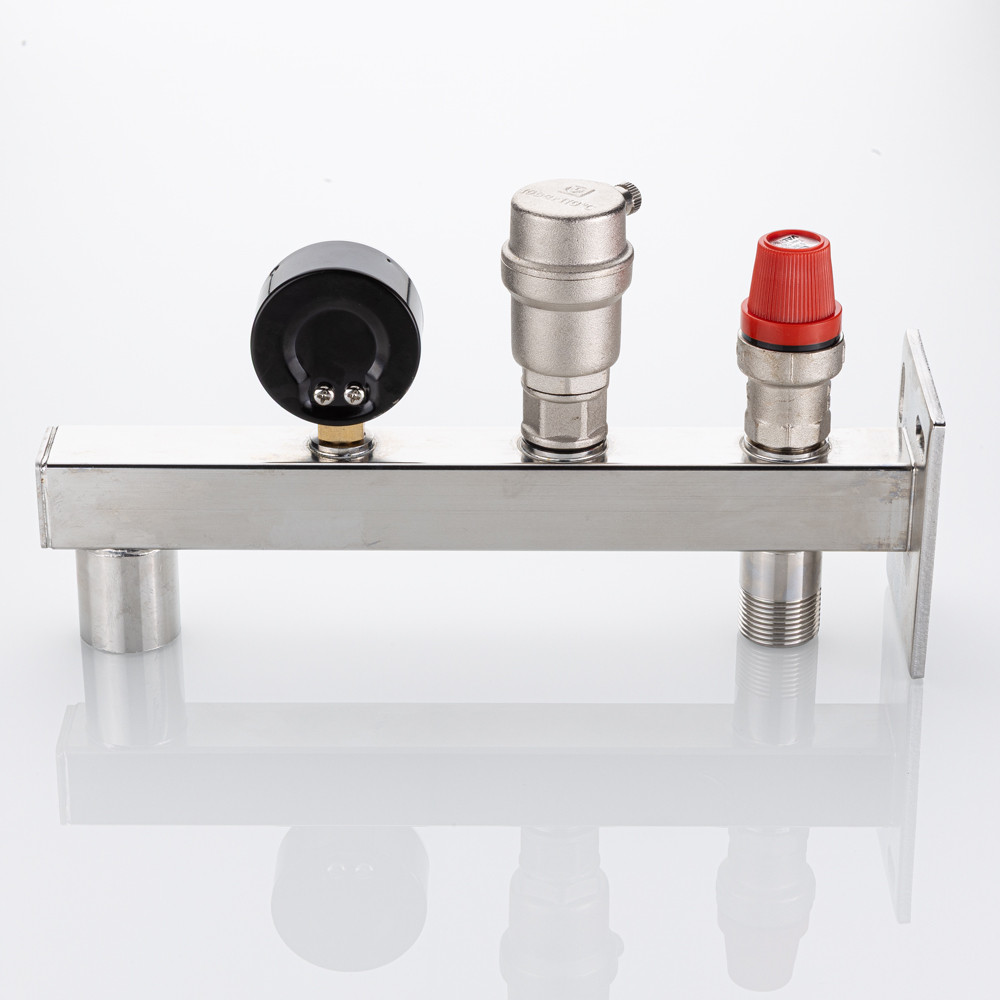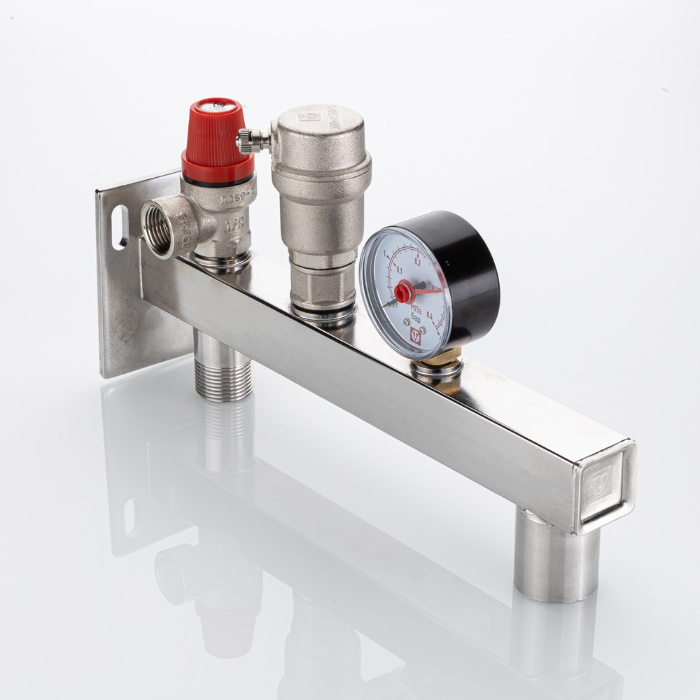 Данная модель группы консольной группы безопасности представляет собой смонтированные на полой консоли из нержавеющей стали предохранительный клапан с фиксированной настойкой, автоматический воздухоотводчик, манометр со шкалой 0–4 или 0–10 бар.