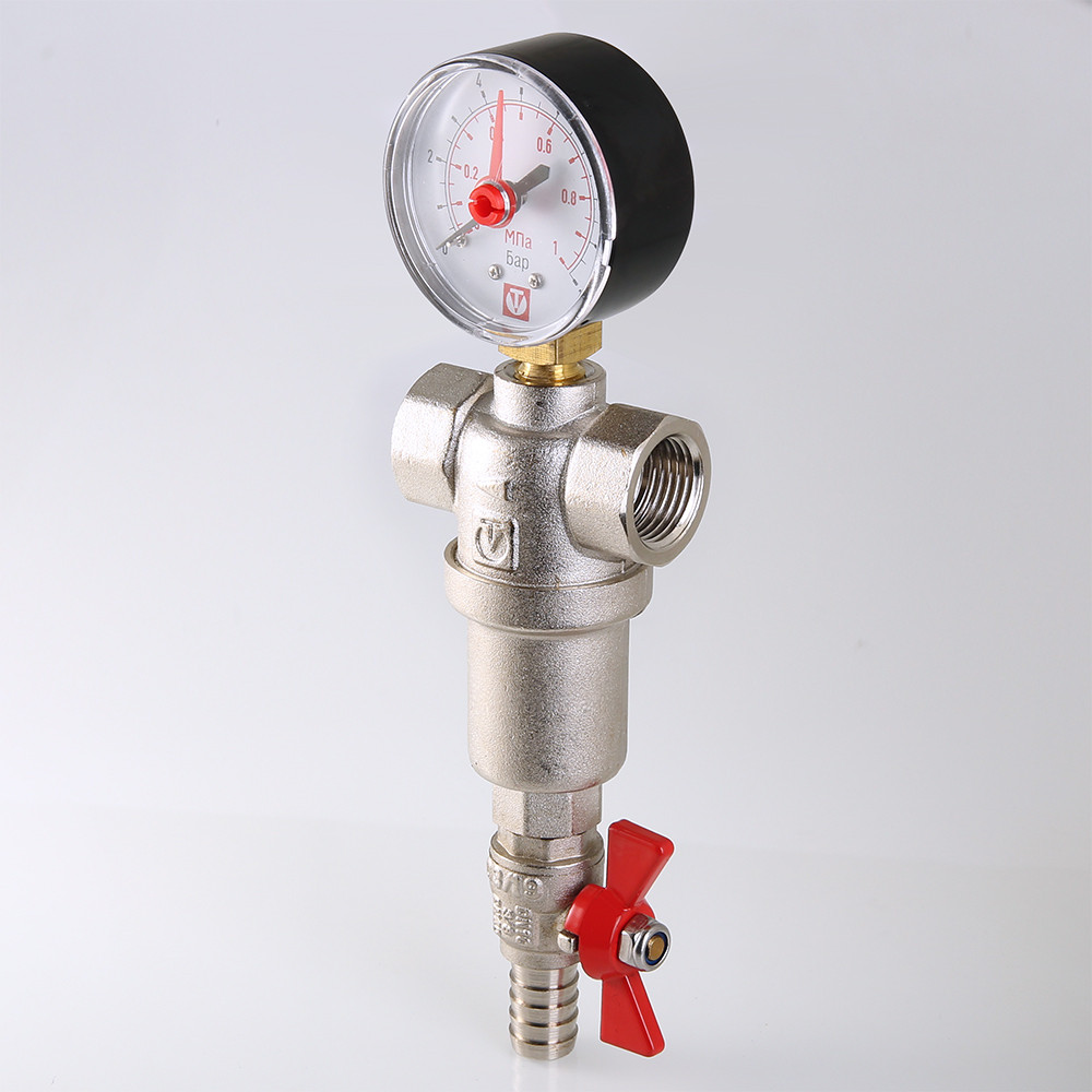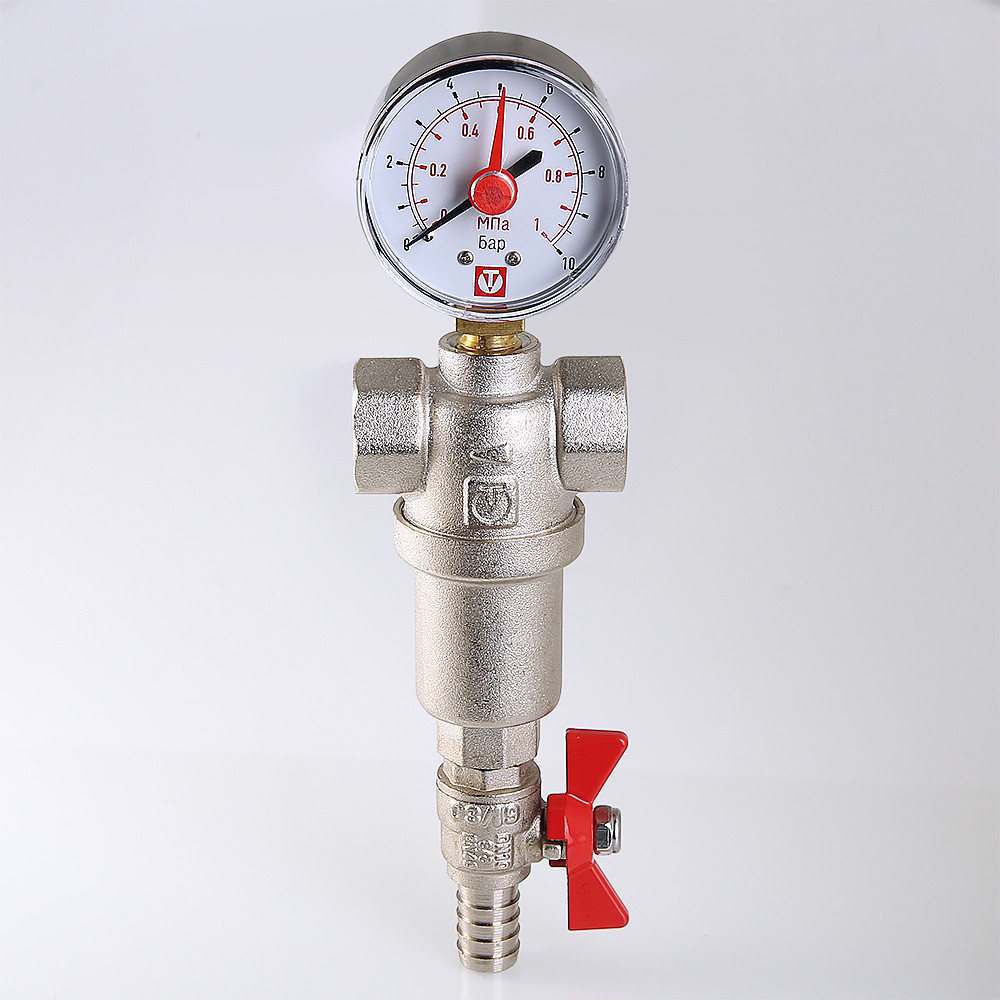 Компактный фильтр механической очистки воды с возможностью удаления накопившихся загрязнений без извлечения сетчатых вставок (промывной фильтр). Оснащен двумя (один в другом) фильтроэлементами из нержавеющей стали. Размер ячеек сетки первичного фильтроэлемента – 500, вторичного – 100 мкм. Корпус и колба фильтра выполнены из латуни марки CW617N (европейский стандарт EN 12165), никелированы. Предусмотрены дренажный шаровой кран со штуцером для подключения шланга и манометр для контроля уровня загрязненности сеток. Фильтр монтируется в вертикальном положении, колбой вниз. Резьба присоединений – внутренняя.