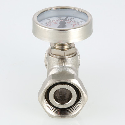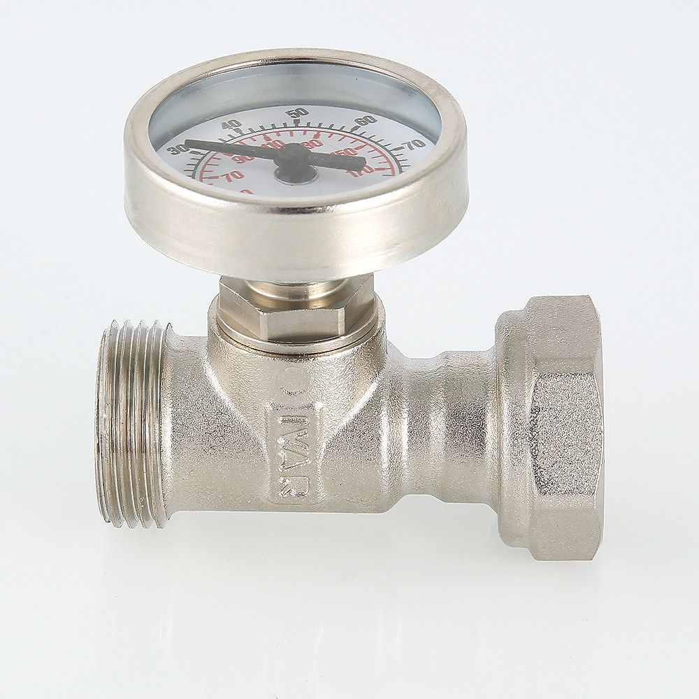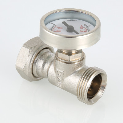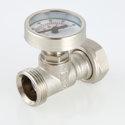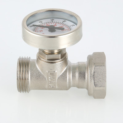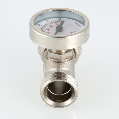 Тройник с термометром предназначен для контроля температуры теплоносителя в трубопроводных петлях теплого пола или другой инженерной системы. Подключение к коллектору – по стандарту «евроконус» (имеется накидная гайка), резьба для присоединения трубопровода – наружная, 3/4". Тройник выполнен из латуни марки CW617N, никелирован; материал уплотнений – синтетический каучук EPDM. Может устанавливаться как на падающий, так и на обратный коллектор. Укомплектован механическим термометром VT 0617 (погрешность измерений – 3 %, диапазон шкалы – от 0 до 80 °C, диаметр – 41 мм). Максимальная рабочая температура теплоносителя – 120 °C, максимальное рабочее давление – 10 бар.