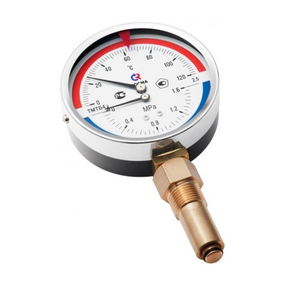 Прибор предназначен для одновременного измерения избыточного давления и температуры воды и других сред, неагрессивных к сплавам меди. Он представляет собой объединенные в одном корпусе деформационный манометр и биметаллический термометр. Для снятия показаний предусмотрены две шкалы – давления и температуры. Комплектуется клапаном, позволяющим демонтировать термоманометр без разгерметизации системы. Класс точности – 2,5. Диаметр корпуса – 100 мм. Диапазон измеряемых температур – от 0 до 120 или 150 °С, давления – от 0 до 6 или 10 бар. Присоединение – радиальное (нижнее). Диаметр присоединения – 1/2". Длина погружной гильзы – 46 мм.