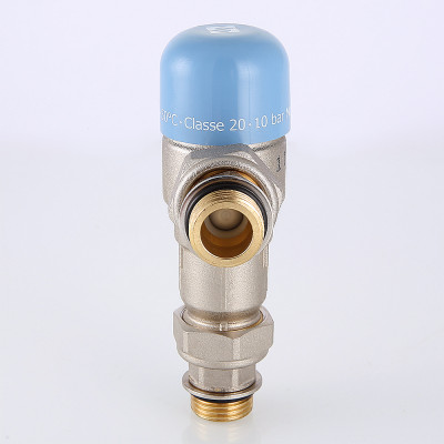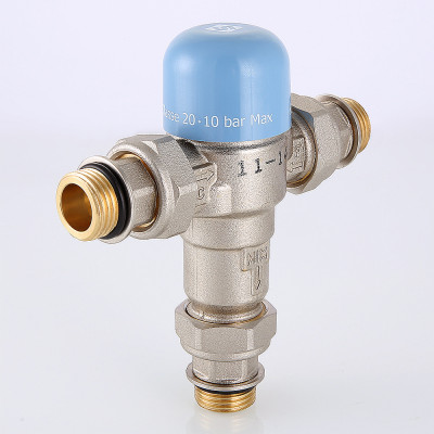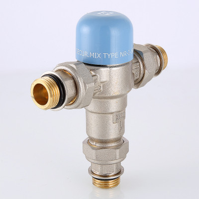 Трехходовой термостатический смесительный клапан VALTEC THERMOMIX предназначен для автоматического поддержания заданной температуры в системе горячего водоснабжения. Ее превышение исключается даже при полном отключении холодной воды, что позволяет использовать смеситель в школах, детских садах, других общественных зданиях. Клапан оперативно реагирует на изменение температуры и давления входящих потоков. Модель NR – нерегулируемая, с фиксированной заводской настройкой (47 °C). Клапан выполнен из качественной латуни, никелирован. Встроенный термочувствительный элемент – твердотельный (армопарафин). Патрубки клапана соединены накидными гайками с полусгонами. Резьба присоединений – внешняя. Входы смесителя оснащены обратными клапанами из нейлона. Максимальная температура на входе горячей воды – 90 °C, допустимое рабочее давление входных потоков – до 10 бар.