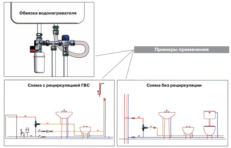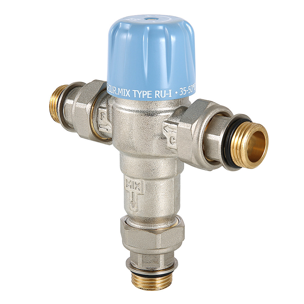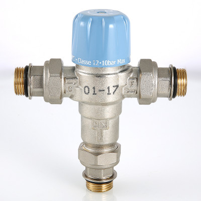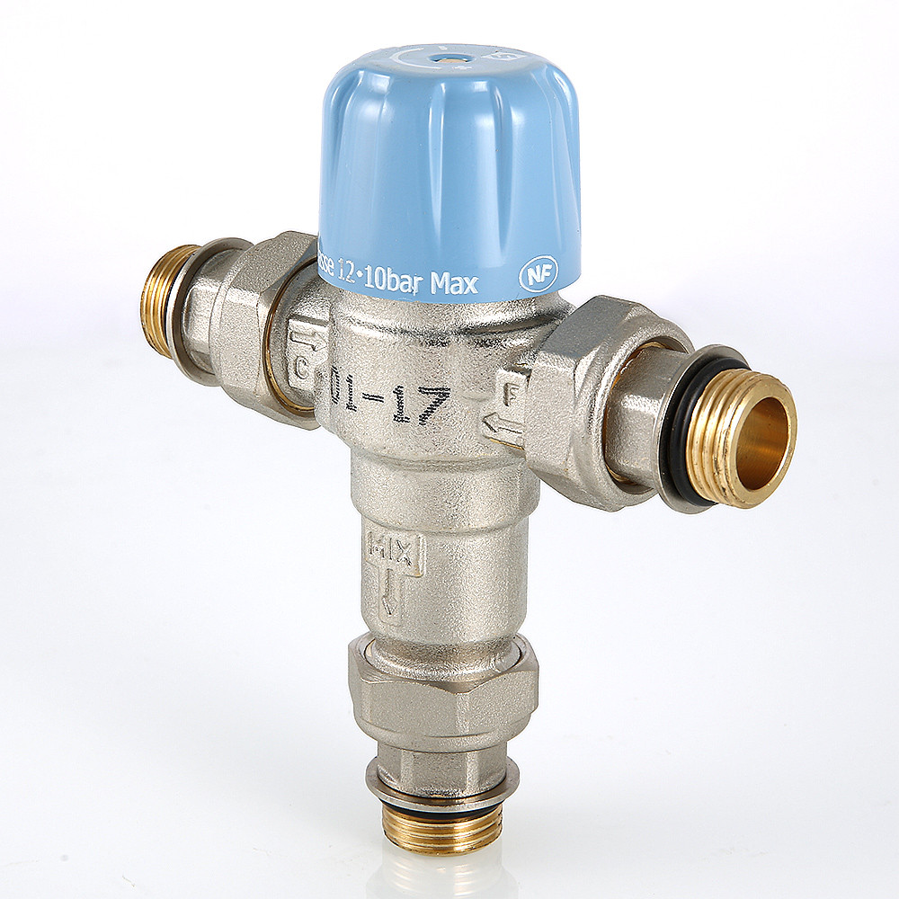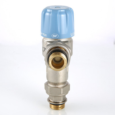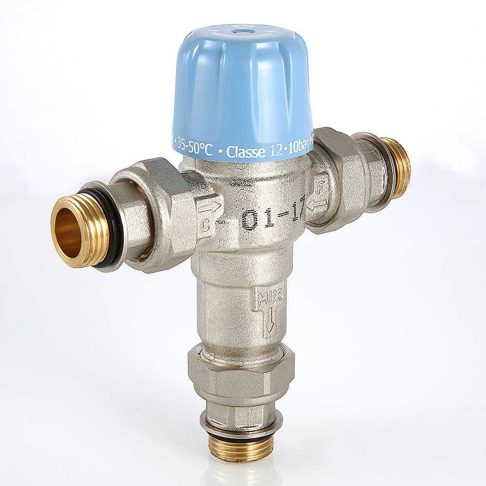 Трехходовой термостатический смесительный клапан с изменяемой в диапазоне от 30 до 50 °C настройкой. Предназначен для автоматического поддержания заданной температуры в системе горячего водоснабжения. Ее превышение исключается даже при полном отключении холодной воды, что позволяет использовать смеситель в школах, детских садах, других общественных зданиях. Термостат оперативно реагирует на изменение температуры и давления входящих потоков. Клапан выполнен из качественной латуни, никелирован. Встроенный термочувствительный элемент – твердотельный (армопарафин). Патрубки клапана соединены накидными гайками с полусгонами. Резьба присоединений – внешняя. Входы смесителя комплектуются обратными клапанами из нейлона. Максимальная температура на входе горячей воды – 90 °C, допустимое рабочее давление входных потоков – до 10 бар.