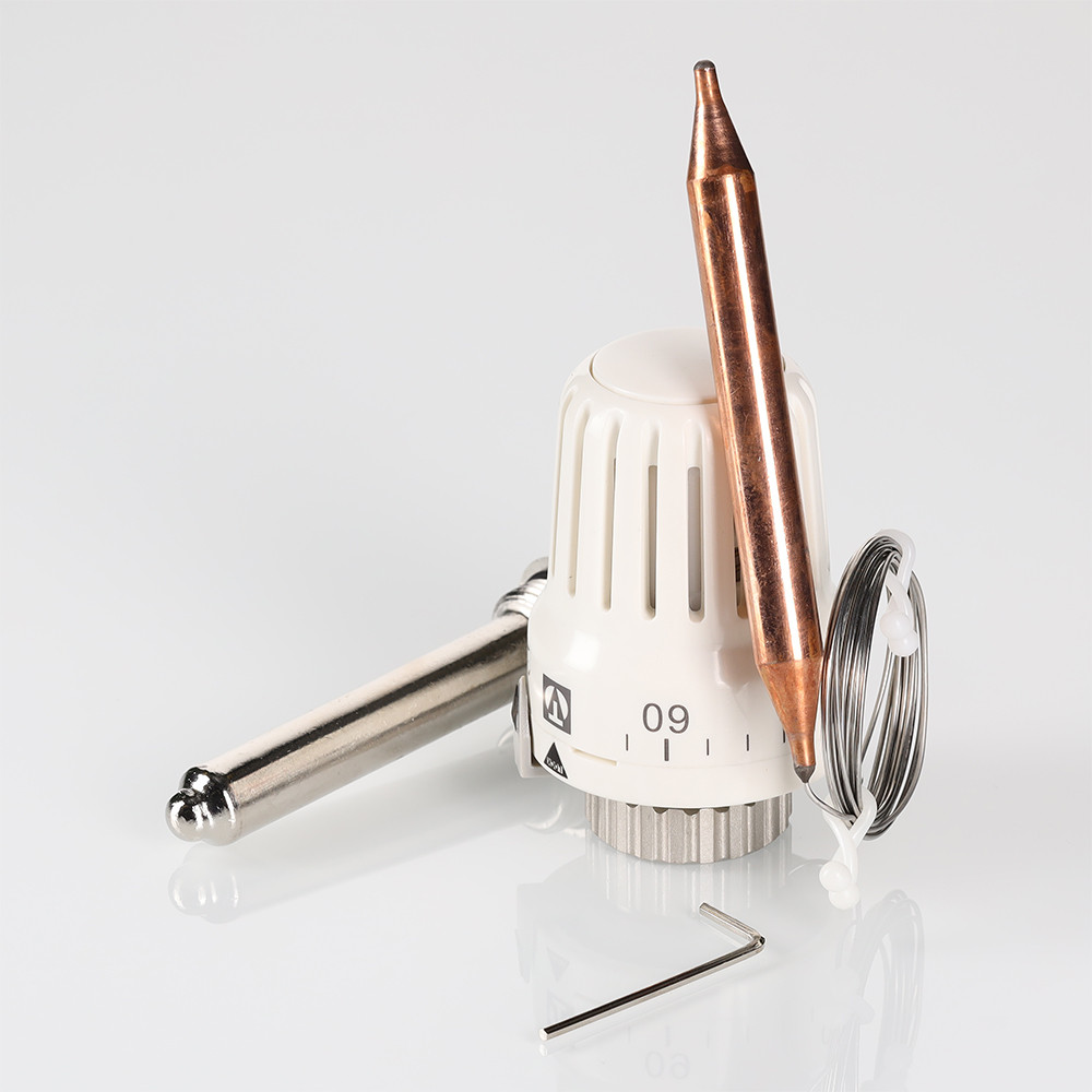 Сильфонная емкость термоголовки и соединенный с ней медной капиллярной трубкой длиной 2 м термочувствительный элемент (датчик) заполнены этилацетатом. Коэффициент объемного расширения этого вещества на 30 % выше, чем у толуола, обычно применяемого в жидкостных термоголовках. Это делает работу терморегулятора более эффективной: сокращается время реакции на изменение регулируемой температуры, а точность регулирования практически не зависит от скачков давления в системе.