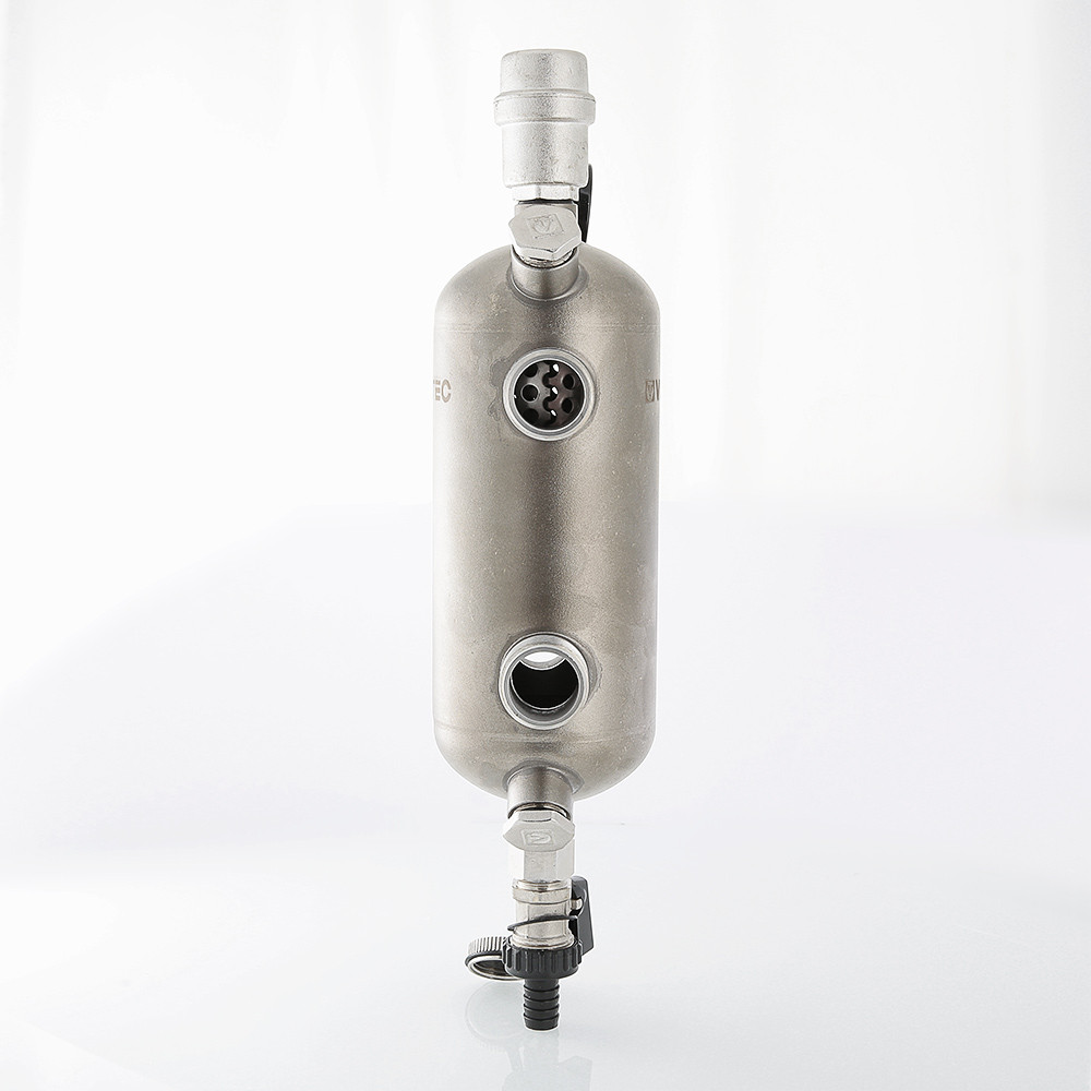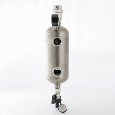 Гидравлическая стрелка из нержавеющей стали комплектуется манометром, дренажным клапаном, автоматическим воздухоотводчиком с отсекающим клапаном. На корпусе предусмотрены резьбовые патрубки для дополнительной установки датчика температуры, термометра, магнитного шламоуловителя. Патрубки заглушены резьбовыми пробками.