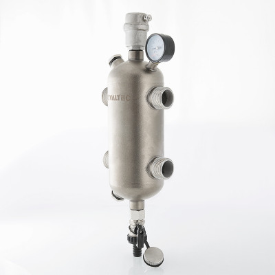 Конструкторы VALTEC дополнили гидрострелку спиральным сепаратором, интенсифицирующим отделение воздуха из теплоносителя, а также разделительной перегородкой, снижающей теплопотери из-за конвекции рабочей среды. Оба элемента выполнены перфорированными, из нержавеющей стали.