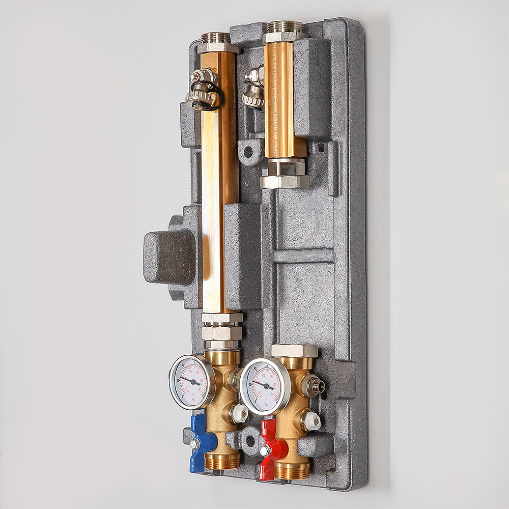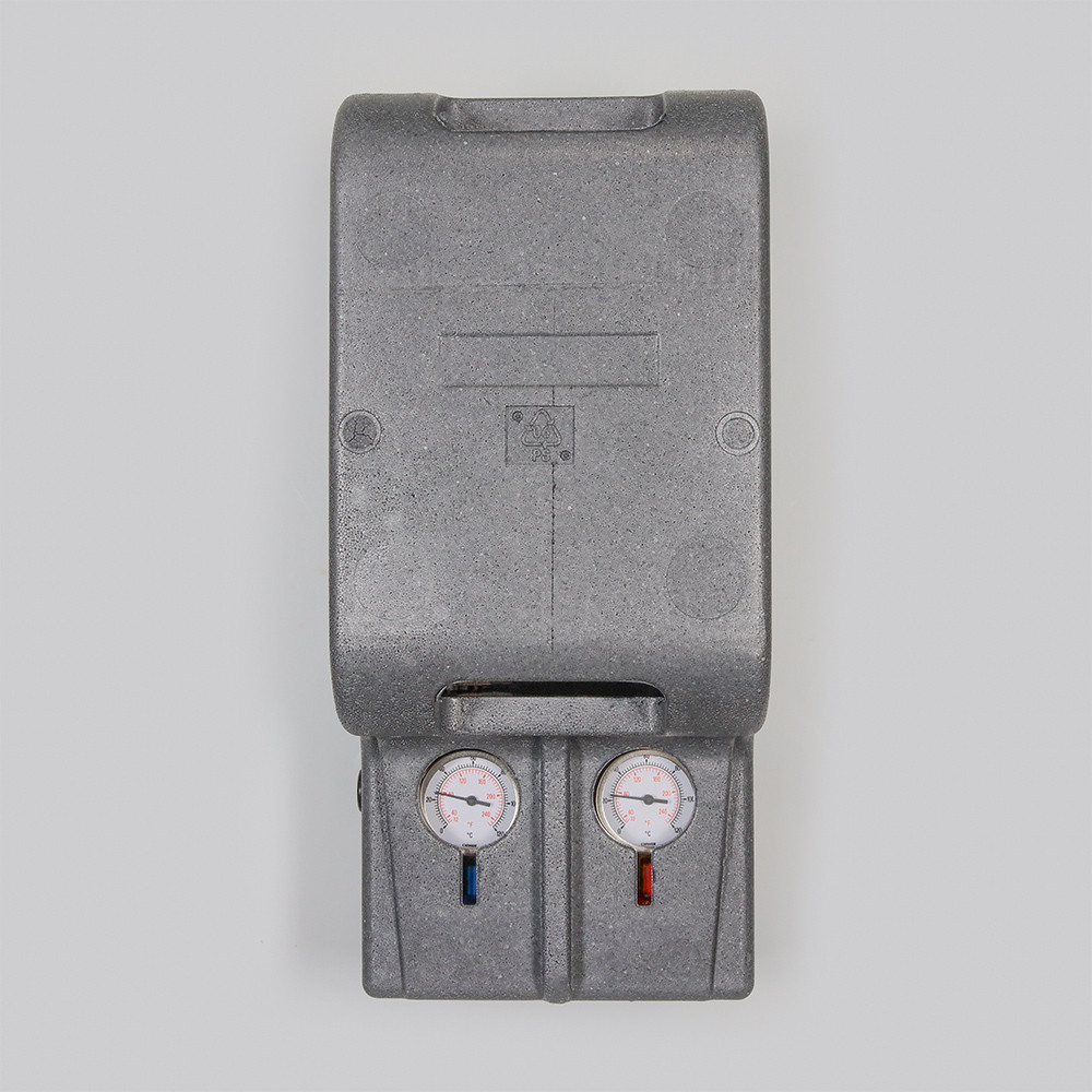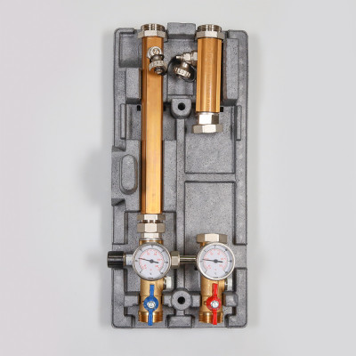 Насосный модуль VT.VAR11 предназначен для присоединения к коллекторному модулю VT.VAR30 высокотемпературного водяного контура, в котором предусмотрено ручное или автоматическое регулирование расхода теплоносителя. Для защиты циркуляционного насоса такого контура от работы «на закрытую задвижку», а также для сохранения гидравлической устойчивости системы в целом в модуле предусмотрен байпас с регулируемым перепускным клапаном. Линии подачи и «обратки» оснащены поворотными дренажными кранами, стрелочными термометрами, ручными воздухоотводчиками. На выходе подающего трубопровода установлен шаровой кран, в возвратной линии – обратный клапан. Модуль снабжен также теплоизоляцией из пенополистирола и средствами крепежа. Насос заказывается отдельно, в зависимости от гидравлических характеристик подсоединяемого контура.
