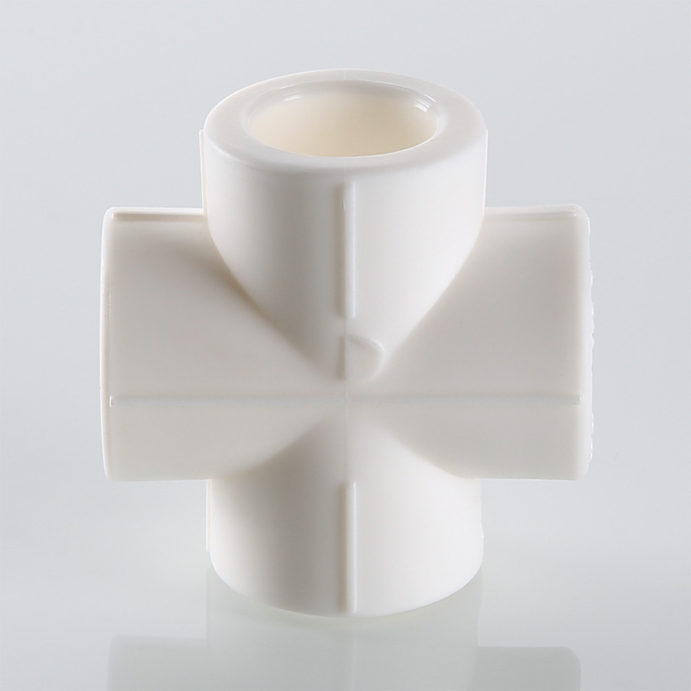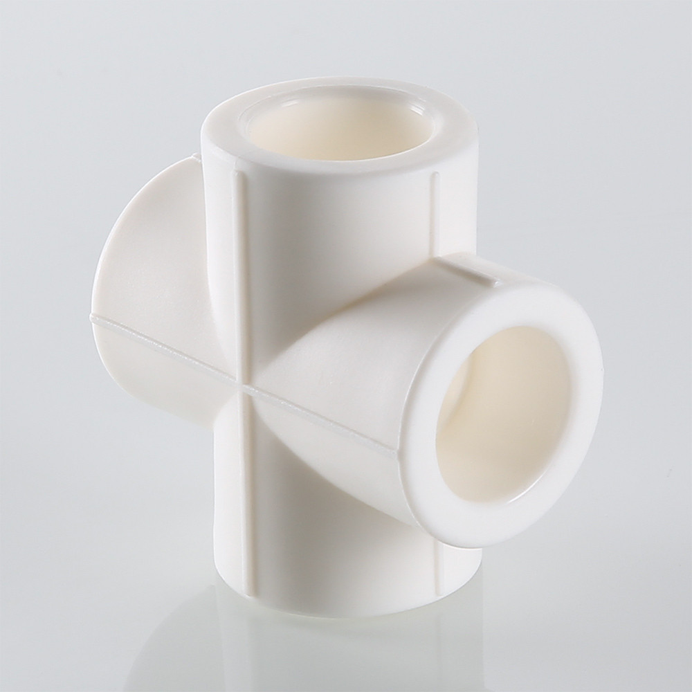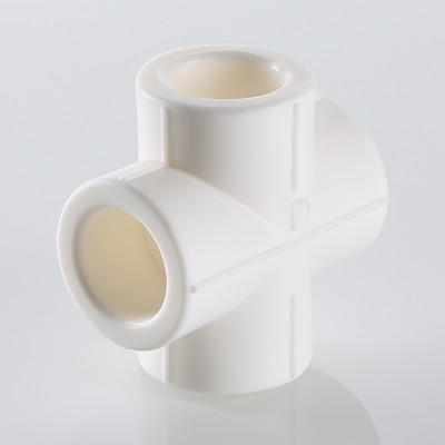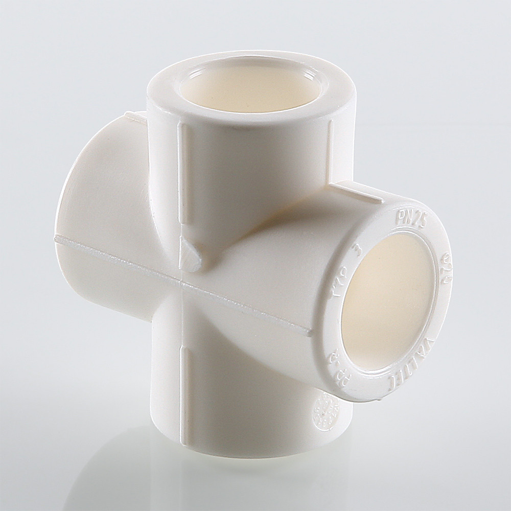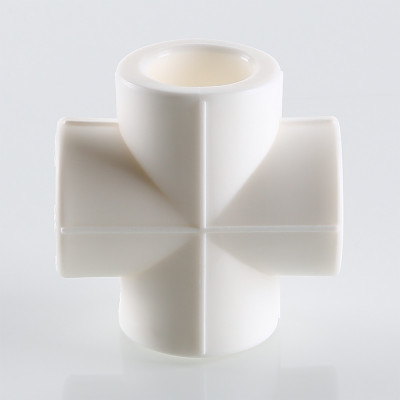 Фитинг для соединения четырех полипропиленовых труб равного диаметра (крестовина). Монтаж производится методом раструбной сварки.