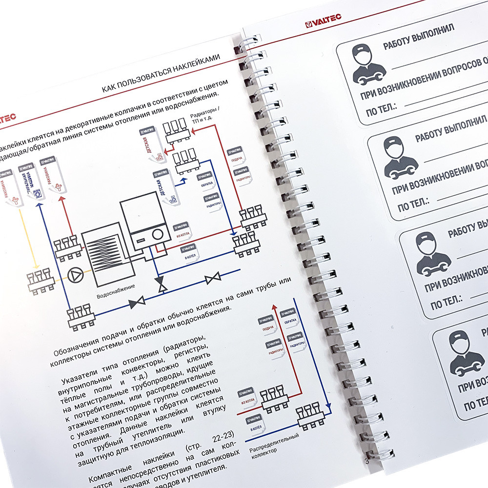 В комплект входят наклейки с обозначением потребителей ХВС и ГВС, отопительных контуров по помещениям и труб в самой котельной.