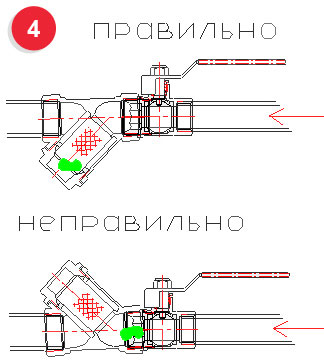 Если промывные фильтры с удлиненной колбой и сливным краном ни одному монтажнику не придет в голову поставить на вертикальном участке трубопровода или сливным краном вверх, то ошибки в установке прямых и косых фильтров встречаются сплошь и рядом (рис. 4).