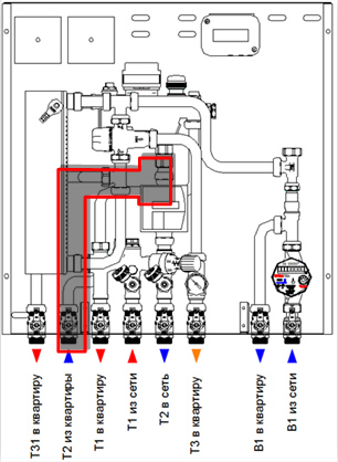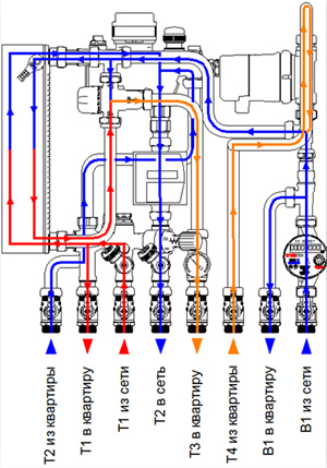 - холодная вода на входе в станцию разделяется на два потока, один идет на нужды квартиры в холодной воде, а второй – в теплообменник для последующего нагрева;