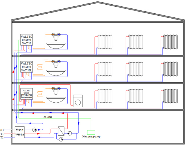 Для сравнения рассмотрим схему тепло- и водоснабжения того же здания, построенную с применением станций VALTEC Control SAT H (рис. 12).