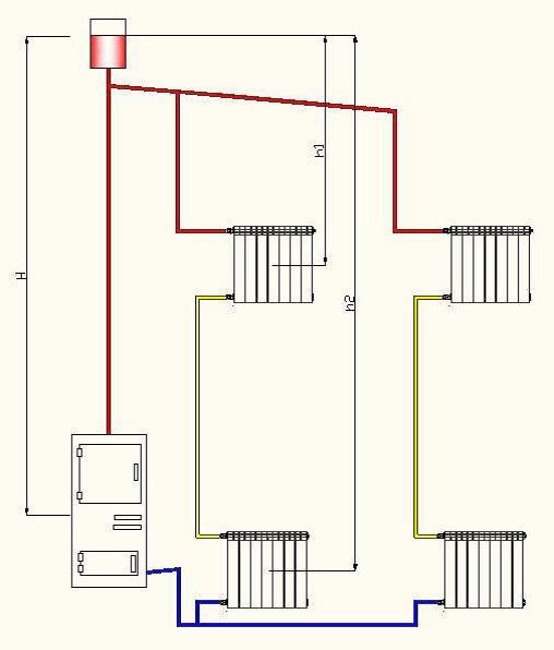 Для этого используем пример классической двухтрубной гравитационной системы отопления (рис. 2), со следующими исходными данными: первоначальный объем теплоносителя в системе – 100 л; высота от центра котла до поверхности нагретого теплоносителя в баке Н = 7 м; расстояние от поверхности нагретого теплоносителя в баке до центра радиатора второго яруса h1 = 3 м, расстояние до центра радиатора первого яруса h2 = 6 м.
