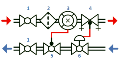 Рис. 11. Пример схемы квартирного узла с регулятором перепада давлений: 1 – шаровой кран; 2 – фильтр; 3 – теплосчетчик; 4 – балансировочный клапан; 5 – шаровой кран с патрубком для датчика температуры; 6 – регулятор перепада давлений