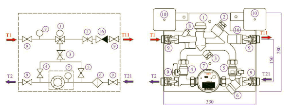Эти станции позволяют осуществлять гидравлическую балансировку и аппаратную настройку вторичного контура и байпаса, производить автоматическое переключение направления потока с квартиры в байпас по команде комнатного термостата и организовывать удаленное считывание показаний теплосчетчика по проводной или беспроводной сети. Тепломеханическая схема станции приведена на рис. 13.