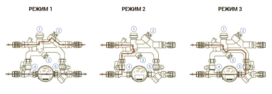 - теплоноситель направлен через настроечный байпас для настройки балансировочного клапана рабочего байпаса (поз. 3 на схеме, режим 3).