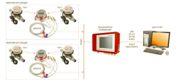По проводной шине M-Bus сигнал передаётся на концентратор, а далее любым способом (дисплей, компьютер, карта памяти, интернет, проводная сеть, модем) – на диспетчерский пункт.