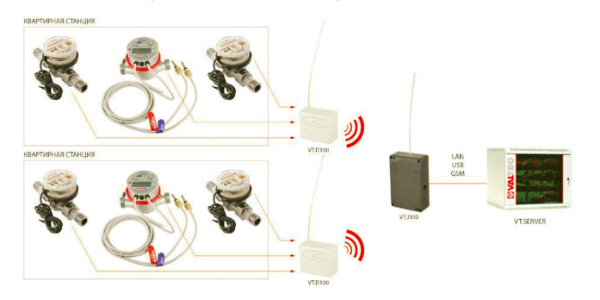 При беспроводной системе АСКУЭ VALTEC CASCAD в состав квартирной станции включаются водосчетчики и теплосчетчик с импульсными выходами, которые через трёхканальный преобразователь импульсов VT.D100 и концентратор VT.J100 передают данные на сервер диспетчеризации VT.SERVER. Сервер может обрабатывать до 3500 точек учёта (рис. 21).