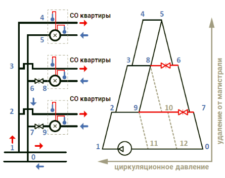 В системе отопления (СО) квартиры падение давление показано участком 4–5, причём такое же по величине падение давление происходит на всех этажах (участки 3–8 и 2–9). Возвращается теплоноситель по обратной магистрали 5–0.