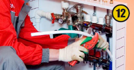 Концы труб подключают к распределительным коллекторам. Сначала трубу необходимой длины отрезают труборезом (12), калибратором VALTEC снимают фаски (13), устанавливают обжимной соединитель (14), затем присоединяют ее к коллектору и затягивают гаечным ключом (15).