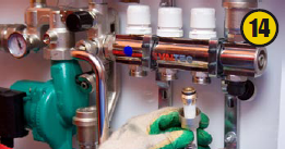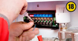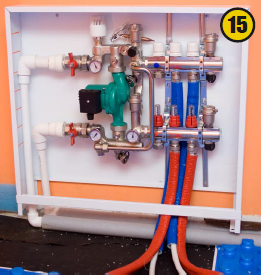 На коллекторах устанавливают сервомоторы (16), регулирующие температуру при помощи комнатных термостатов (17).Сервомоторы и термостаты подключают к коммуникатору (18), который позволяет управлять циркулярным насосом насосно-смесительного узла — включать и выключать систему отопления пола по мере необходимости. По сигналу термостата сервомотор открывает или закрывает ветку теплого пола.