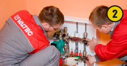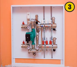 Монтаж системы начинается с установки коллекторного шкафа (1) и насосно-смесительного узла VALTEC Combimix с коллекторным блоком (2, 3). Последний создает в системе отопления здания отдельный циркулярный контур, в котором температура теплоносителя понижена до необходимого значения. По российским нормам в помещении, где люди находятся постоянно, поверхность пола должна нагреваться не более чем до +26 °С. Кроме поддержания заданной температуры в контуре теплых полов, узел позволяет регулировать расход теплоносителя в зависимости от требований пользователя.