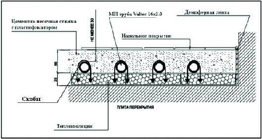 При заливке цементно-песочной стяжки труба должна находиться под давлением воды 0,3 МПа при комнатной температуре. Минимальная высота заливки над поверхностью трубы должна быть не менее 3 см (максимальная рекомендуемая высота, по европейским нормам - 7 см). Цементно-песчаная смесь должна быть не ниже марки 400 с пластификатором. После заливки стяжку рекомендуется «провибрировать». При длине монолитной плиты более 8 м или площади больше 40 м2 необходимо предусмотреть швы между плитами минимальной толщиной 5 мм, для компенсации теплового расширения монолита. При прохождении труб через швы они должны иметь защитную оболочку длиной не менее 1 м.