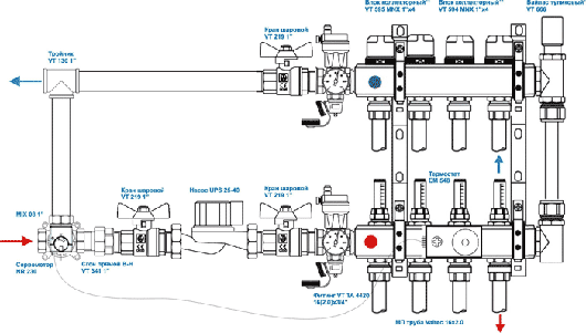 Комплект теплого пола для обогрева помещений площадью более 60 м2 с насосно- смесительным узлом с автоматическим поддержанием температуры теплоносителя. Максимальная мощность системы теплых полов 20 кВт. В системе используется коллекторный блок с регулирующими клапанами с расходомерами (опция), для обеспечения равного расхода теплоносителя в петлях теплого пола (гидравлической балансировки петель).
